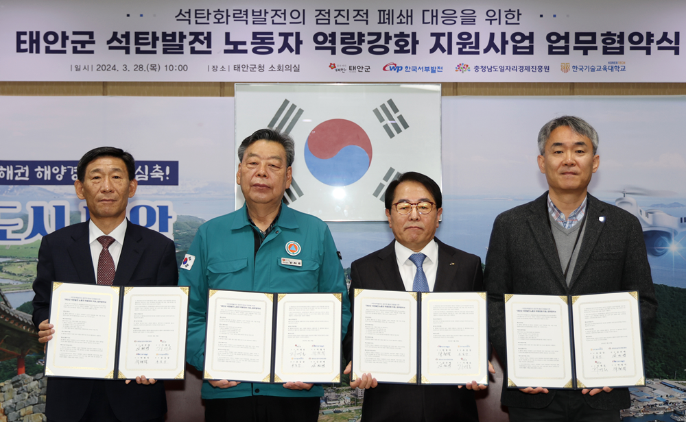 [대학저널 온종림 기자] 한국기술교육대학교가 28일 태안군청에서 태안군, 한국서부발전(주), (재)충청남도일자리경제진흥원과 ‘태안군 석탄 발전 노동자 역량강화 지원 업무협약’을 체결했다.