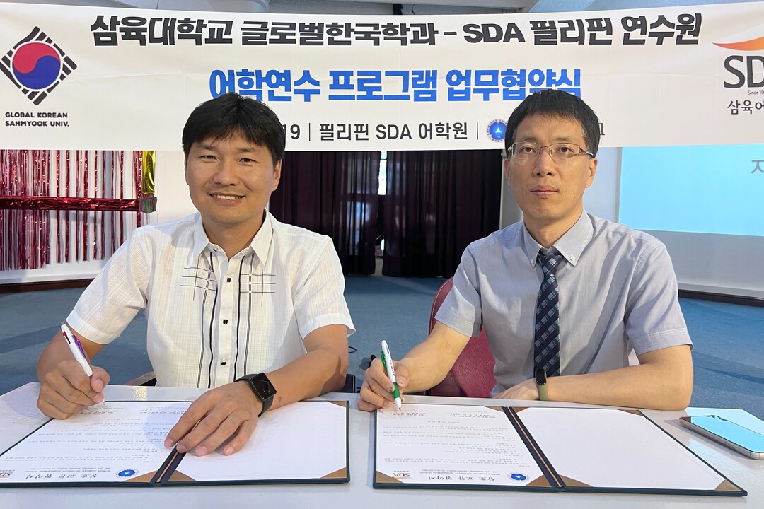 | 백준(왼쪽) SDA삼육어학원 필리핀연수원장과 삼육대 김봉근 글로벌한국학과장이 산학협력 협약을 체결한 뒤 협약서에 서명하고 있다. 사진=삼육대 제공 |