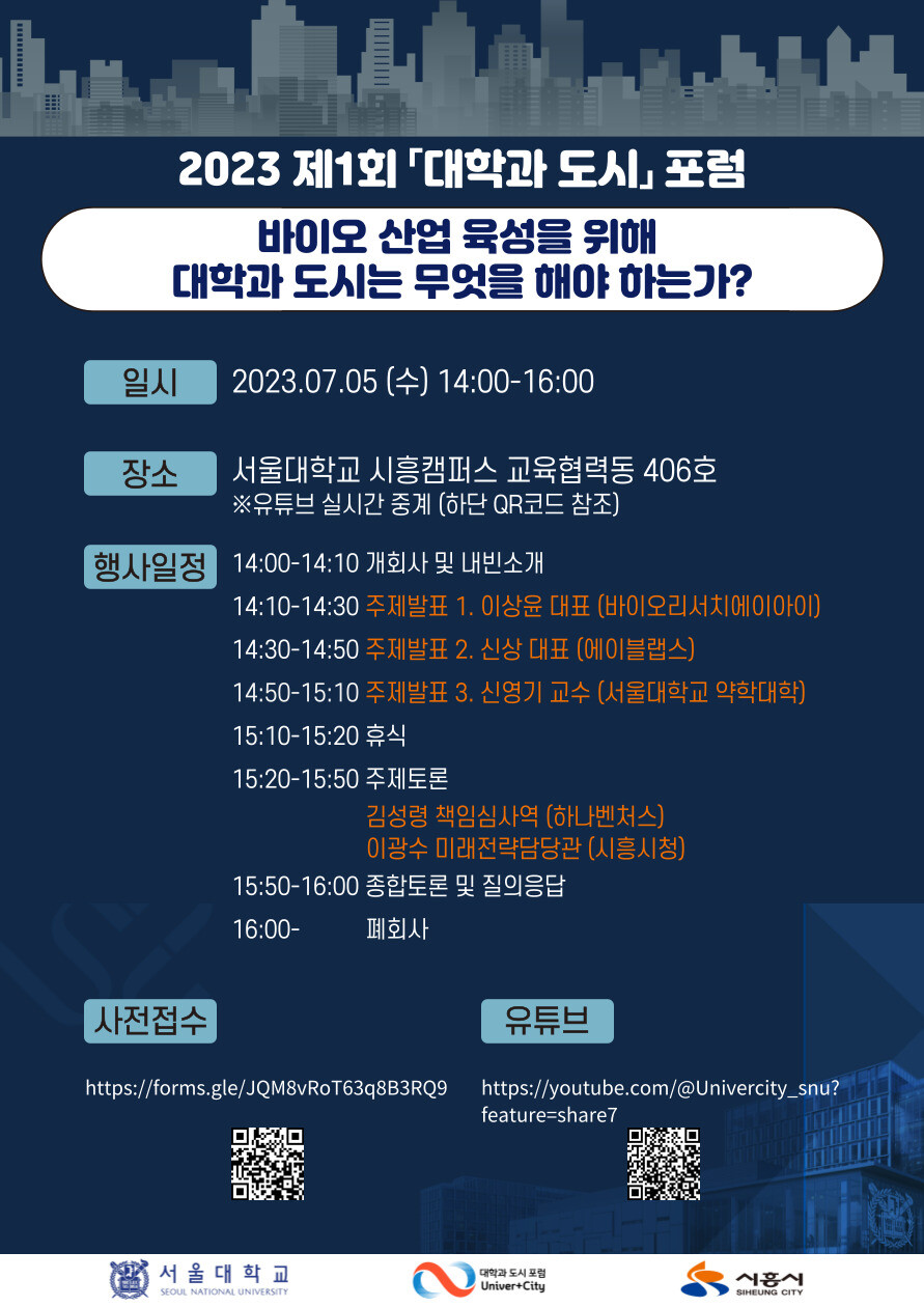 ‘대학과 도시’ 포럼 (Univer+City)은 서울대와 시흥시가 대학과 도시의 상생 발전을 위한 협력과 미래를 함께 고민하고자 만든 공론의 장으로, 대학과 도시를 인류문명 발전의 2대 요소로 규정하고 대학과 도시, 양자의 협력 및 혁신과 관련된 각 분야의 전문가를 초청하여 약 3주마다 개최된다.