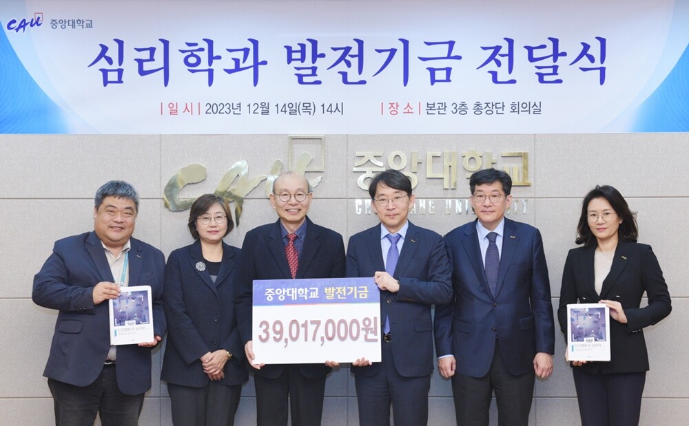 중앙대는심리학과 교수진은 지난 14일 서울캠퍼스 201관(본관) 3층 총장단 회의실에서 열린 ‘심리학과 발전기금 전달식’을 통해 인세수익 3,901만 7,000원을 쾌척했다.