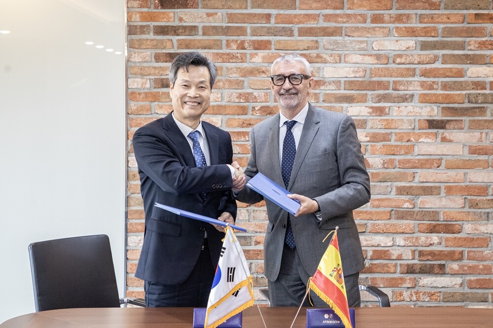 원용걸 서울시립대 총장과 프란시스코 피넬라 코르바초 스페인 카디스대 총장이 4일 학술 교류 및 학생 교류에 관한 협정을 체결한 후 악수하고 있다. 사진=서울시립대 제공 |