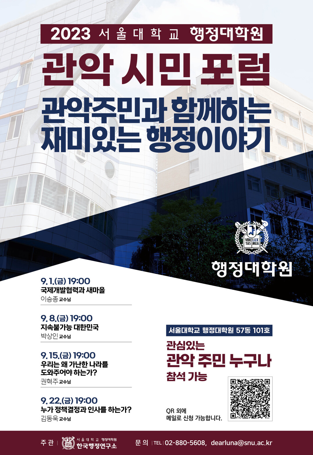이번 포럼은 ‘관악주민과 함께 하는 재미있는 행정 이야기’를 부제로 국제사회 안에서 변화해 온 대한민국의 위상을 살펴본다. 국제개발 협력, 지속가능성, 인사 정책 등 다양한 주제에 대해 행정대학원 교수들이 강연하고 질의 응답 시간을 갖는다.