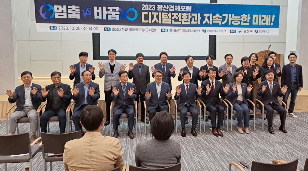 [대학저널 이선용 기자] 호남대학교 LINC 3.0 사업단이 25일 교내 도서관 1층 국제회의실에서 광산구청, 광산구기업주치의센터와 공동으로 디지털 전환과 지속가능한 미래를 주제로 ‘2023 광산경제포럼’을 개최했다.