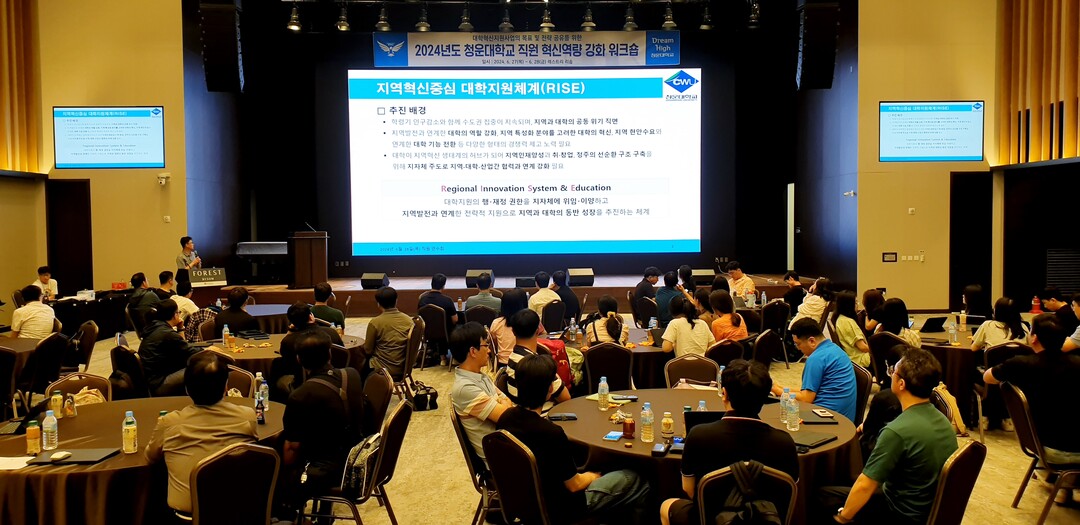 [대학저널 이선용 기자] 청운대학교는 6월 27~28일 대학혁신지원사업의 일환으로 충북 제천에 위치한 레스트리 리솜에서 전 직원이 참여한 2024 하계 직원 혁신역량 강화 워크숍을 개최한다고 27일 밝혔다.