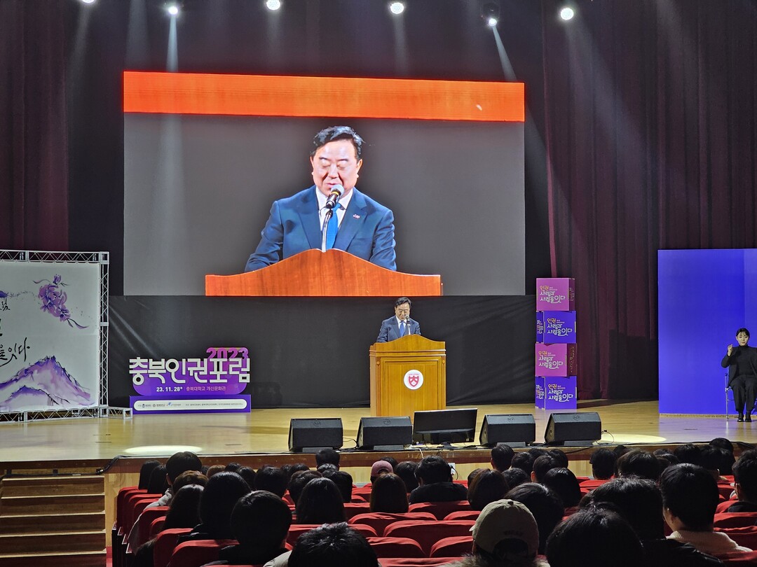 ‘제6회 충북인권포럼’ 및 ‘전국대학·인권기관 관계자 네트워크 파티’에서 고창섭 총장 환영사를 하고 있다. 사진=충북대 제공 |