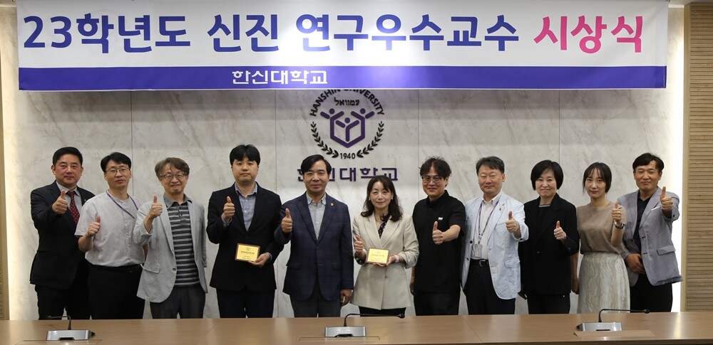 2023학년도 신진 연구우수교수 시상식에서 단체 사진을 찍고 있다. 사진=한신대 제공 |