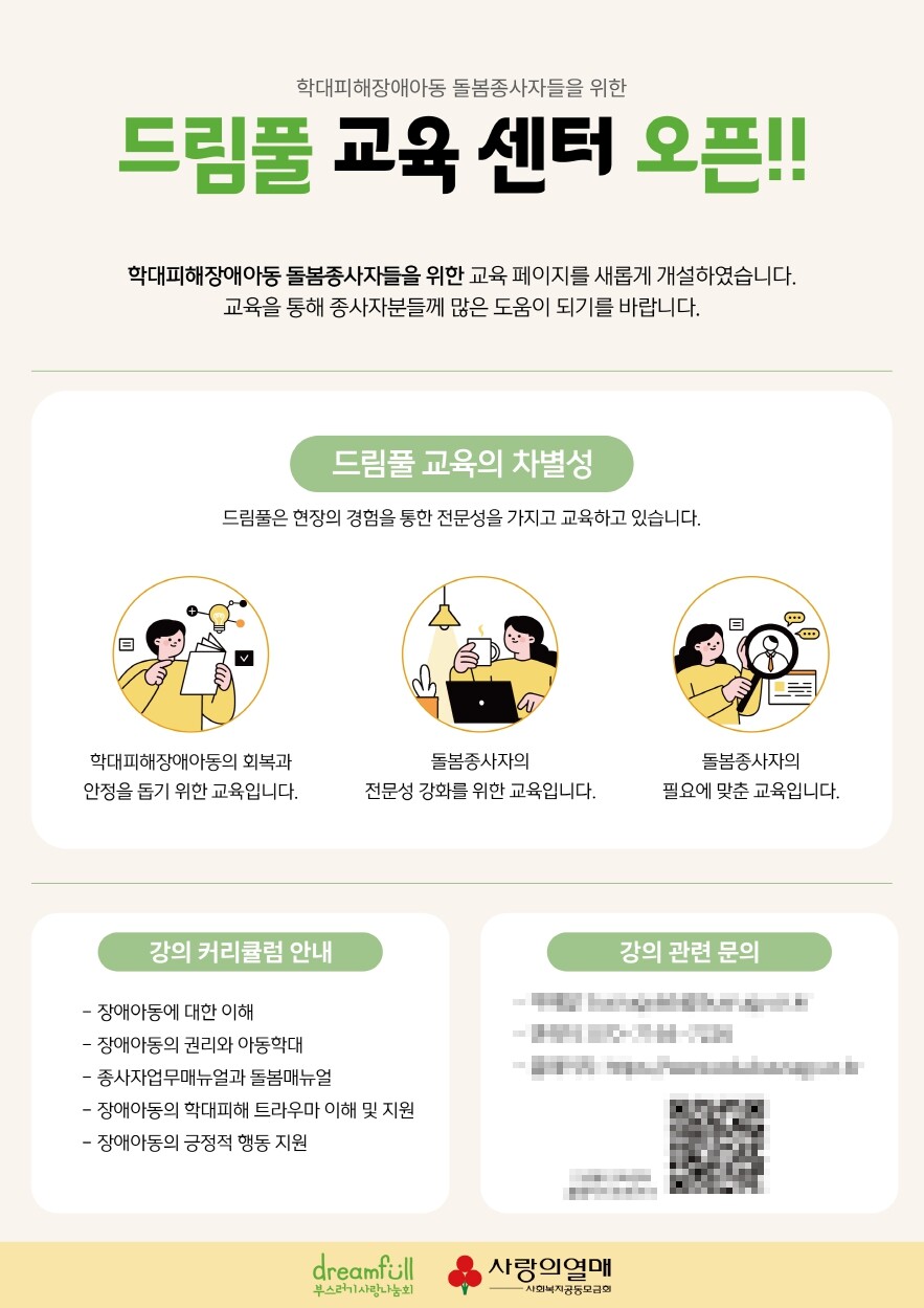 교육센터는 학대피해장애아동 돌봄 종사자뿐만 아니라, 장애아동 돌봄에 관심 있는 누구나 참여할 수 있도록 개방형 교육으로 운영되며, 언제 어디서나 편리하게 학습할 수 있는 것이 특징이다. 이 사업은 사회복지공동모금회의 지원을 받아 학대피해장애아동·청소년 지원 및 보호체계 구축사업의 일환으로 추진되며, 전문가들의 연구와 현장 종사자의 피드백을 반영해 실무에서 즉시 활용할 수 있도록 구성되었다.