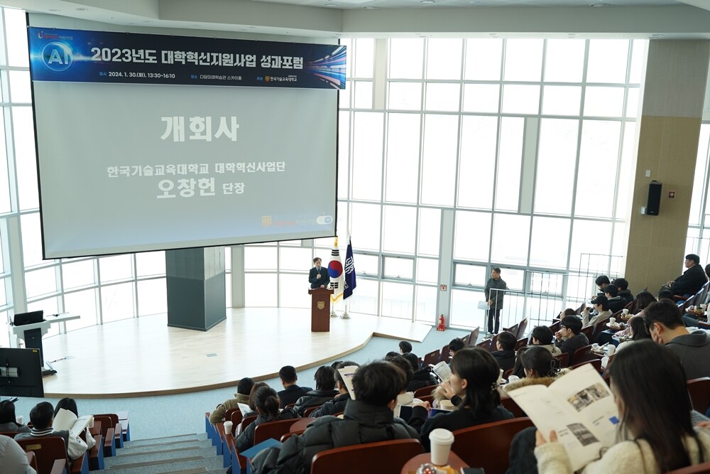 [대학저널 온종림 기자] 한국기술교육대학교 대학혁신사업단이 30일 다담 미래학습관 스카이홀에서 대학혁신지원사업 내·외 관계자 및 재학생 400여 명이 참석한 가운데 ‘2023년도 대학혁신지원사업 성과확산을 위한 성과포럼’을 개최했다.