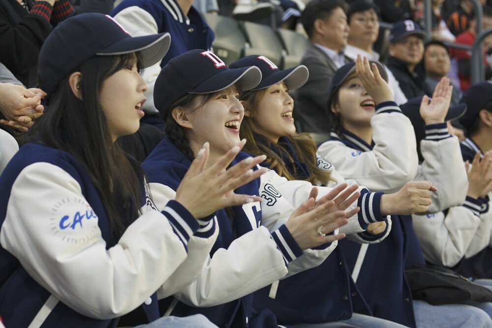 지난 3일 잠실야구장에서 열린 '총장님과 함께 하는 야구 응원전, 미라클 데이'에 참가한 중앙대 학생들이 재단인 두산그룹 산하 두산베어스를 응원하고 있다. 사진=중앙대 제공 |