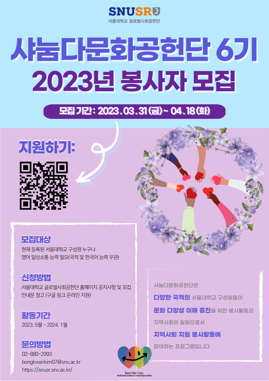 샤눔다문화공헌단 6기 단원은 4월 19일까지 모집하며, 서울대 구성원 누구나 참여할 수 있다.