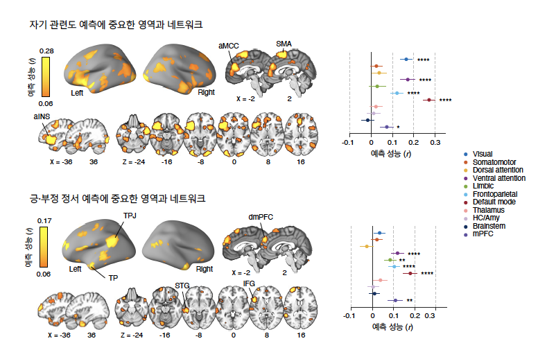 자기관련도와 긍·부정 정서를 예측하는 모델에서 중요한 영역과 네트워크들. |