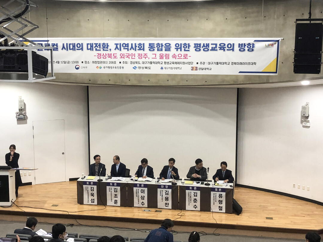 이날 토론은 경북미래라이프대학 이윤주 특임교수의 사회로 진행, 좌장에 대구가톨릭대 김용찬 기획처장, 토론자는 경상북도 지방시대정책국 이상수 교육협력과장, 경북연구원 류형철 공간환경연구실장, 김욱섭 경산 글로벌다문화복지센터장, 김조훈 경주 하이웃이주민센터장, 대구가톨릭대 다문화연구원 김춘수 연구교수가 참여했다.