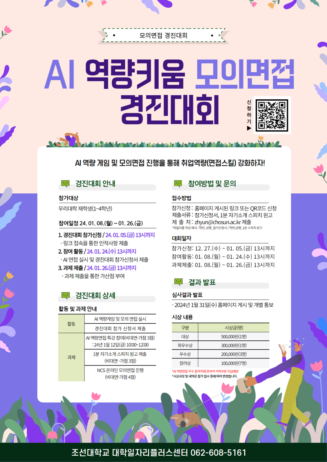 [대학저널 이선용 기자] 조선대학교는 재학생들의 구직스킬을 강화하기 위한 ‘AI 역량키움 모의면접 경진대회’를 개최한다고 8일 밝혔다.