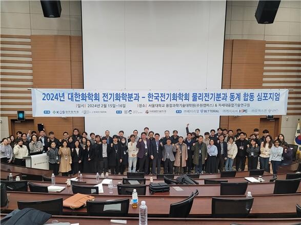 2024년 대한화학회 전기화학분과-한국전기화학회 물리전기분과 동계 합동 심포지엄 참석자들이 기념촬영을 하고 있다. 사진=서울대 제공 |
