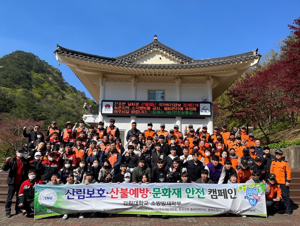 [대학저널 온종림 기자] 강원대학교 소방방재학부는 지난 8일 동해시 무릉계곡에서 문화재청, 동부지방산림청 삼척국유림관리소, 동해시시설관리공단, (사)백두대간보전회, (사)문화재방재학회, 한국전력 동해전력지사, 동해소방서, 동해의용소방대, 한국가스공사 삼척기지본부 등과 함께 등산객들을 대상으로 학부 홍보 및 산불 예방, 문화재 안전 캠페인을 실시했다고 18일 밝혔다.
