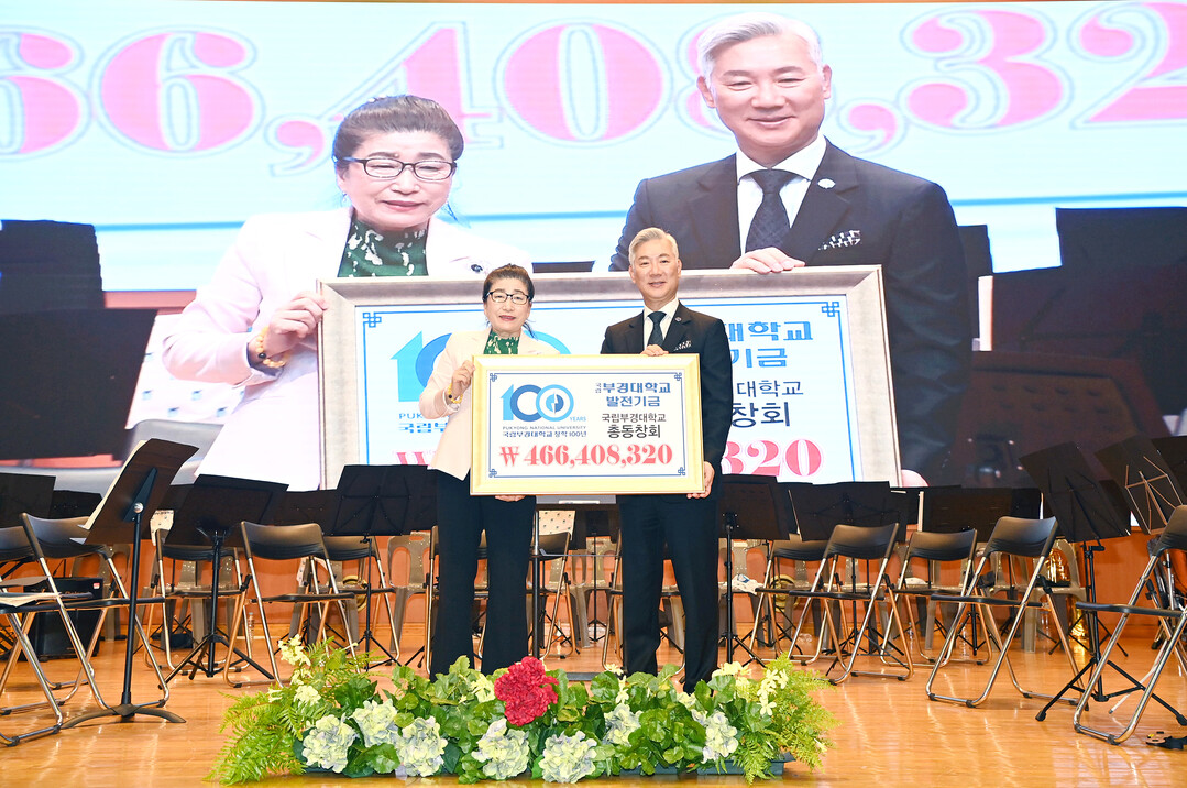 서영옥 총동창회장은 지난 9일 국립부경대 대학극장에서 동문 홈커밍데이 행사로 열린 ‘부경가족 한마음 음악회’ 행사에서 모교 발전을 위해 써 달라며 장영수 총장에게 발전기금을 전달했다.
