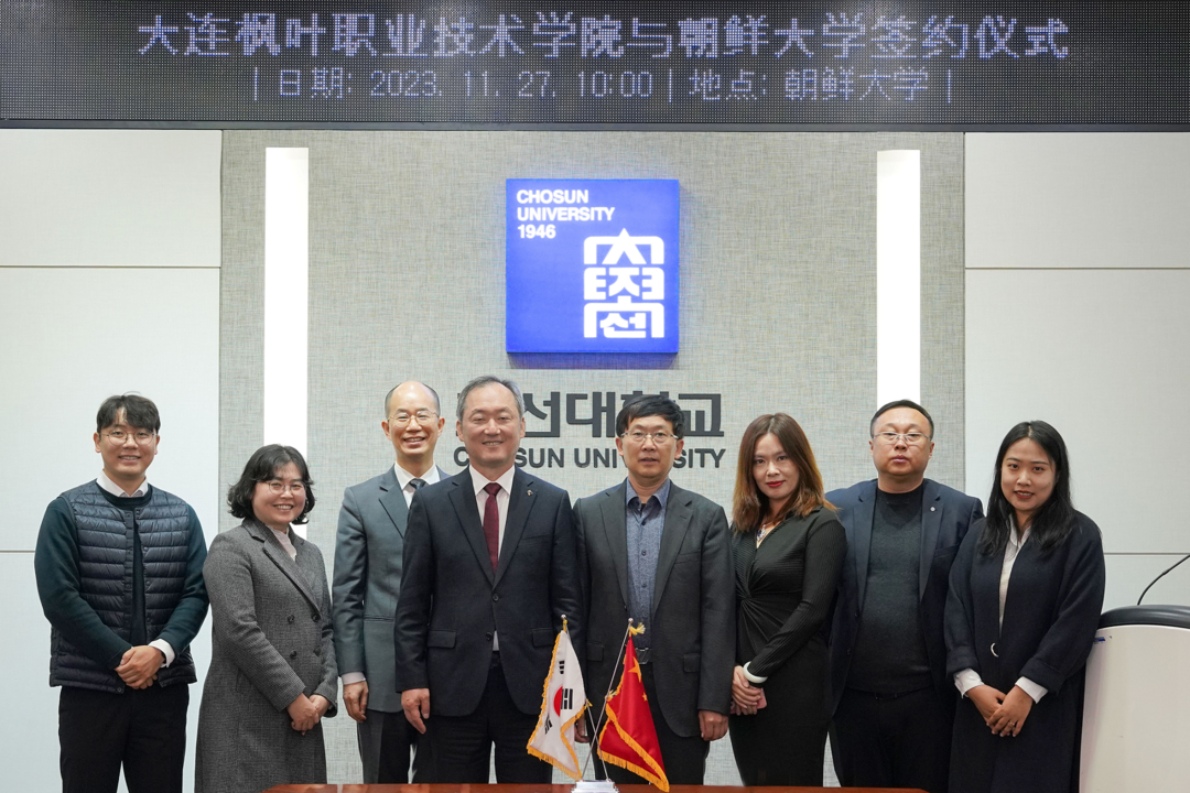 조선대와 중국대련풍엽직업기술대 관계자들이 업무협약 후 기념촬영을 하고 있다. 사진=조선대 제공 |