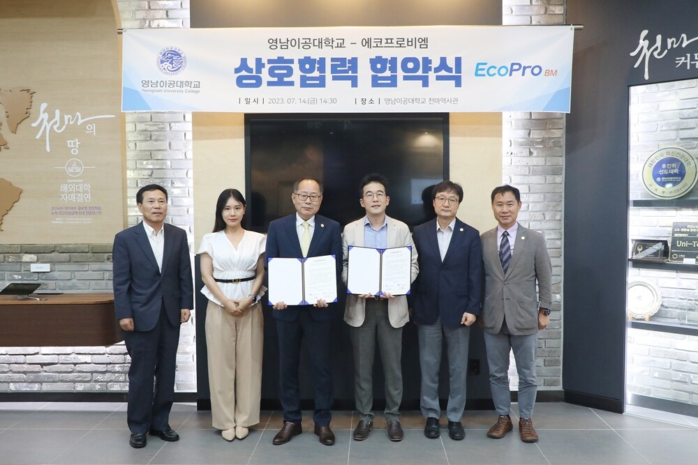 이재용(왼쪽에서 세번째) 총장 등 영남이공대와 에코프로비엠 관계자들이 전문인력 양성을 위한 상호협력 업무협약을 체결한 후 기념촬영하고 있다. 사진=영남이공대 제공 |