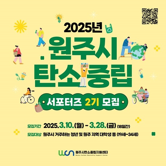 모집 대상은 원주시에 거주하는 19세~34세 청년 및 대학생이며, 3월 10일부터 28일까지 30명을 모집한다. 선발된 서포터즈는 4월 9일 발대식을 시작으로 11월까지 다양한 활동을 통해 원주시의 탄소중립 실천 확산에 앞장설 예정이다.