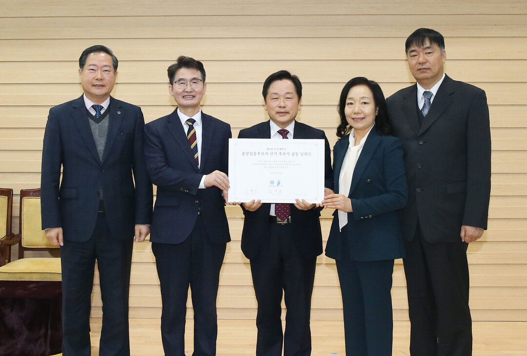 (왼쪽부터) 원성수 공주대 총장, 이병기 교수, 임경호 교수, 김영미 교수, 박현상 제8대총장임용후보자추천위원회 위원장이 함께 기념 사진을 찍고 있다. 사진=공주대 제공 |