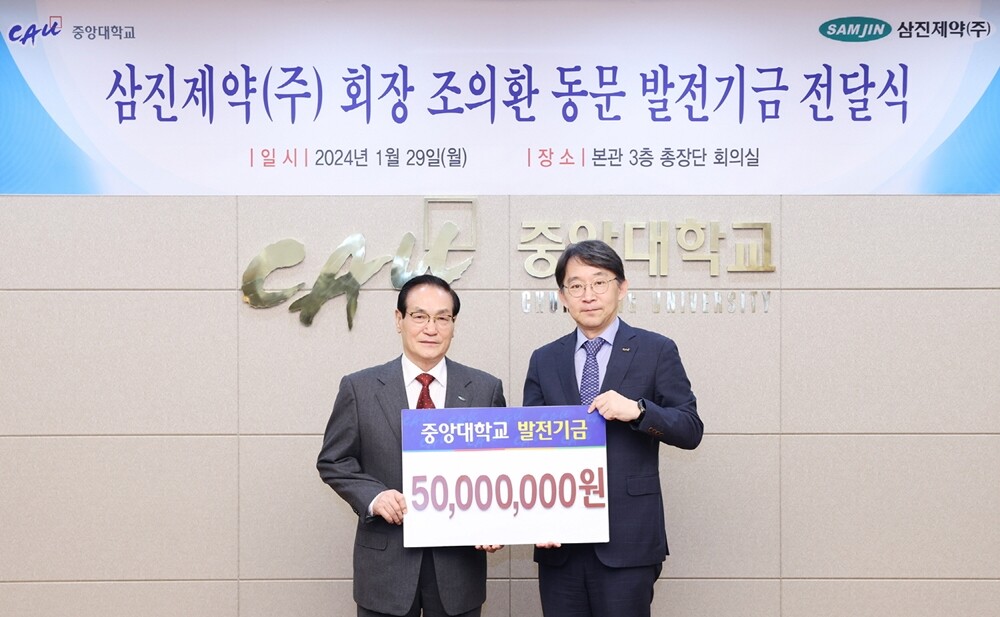 [대학저널 온종림 기자] 삼진제약 창업주 조의환 회장이 모교인 중앙대학교에 5,000만원을 쾌척했다.