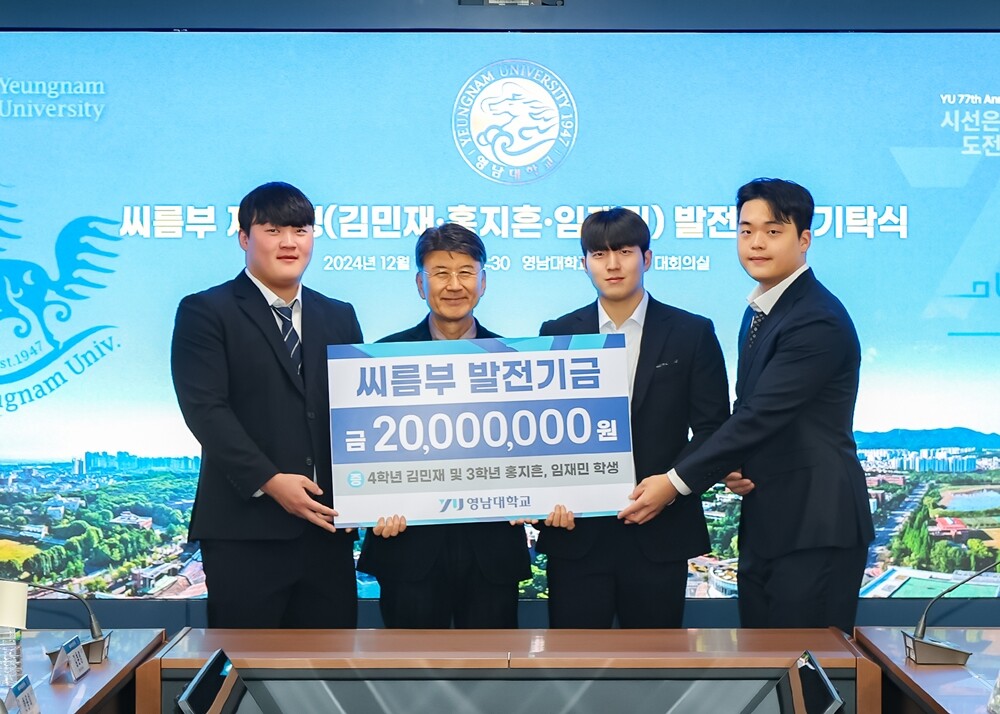 최외출 영남대 총장은 “학업과 운동을 병행하며 영남대를 대표해 눈부신 성과를 올린 여러분이 정말 자랑스럽다. 뛰어난 실력만큼이나 따뜻한 마음을 지닌 씨름부 학생들을 보며 대견함을 느낀다”면서 “오늘 기탁한 소중한 발전기금은 대한민국 대표 문화 씨름을 이어가는 후배들이 보다 나은 환경에서 꿈을 키울 수 있도록 소중히 사용될 것이다. 앞으로도 대한민국 씨름계를 이끌어 갈 여러분의 활약을 진심으로 응원한다”고 말했다.