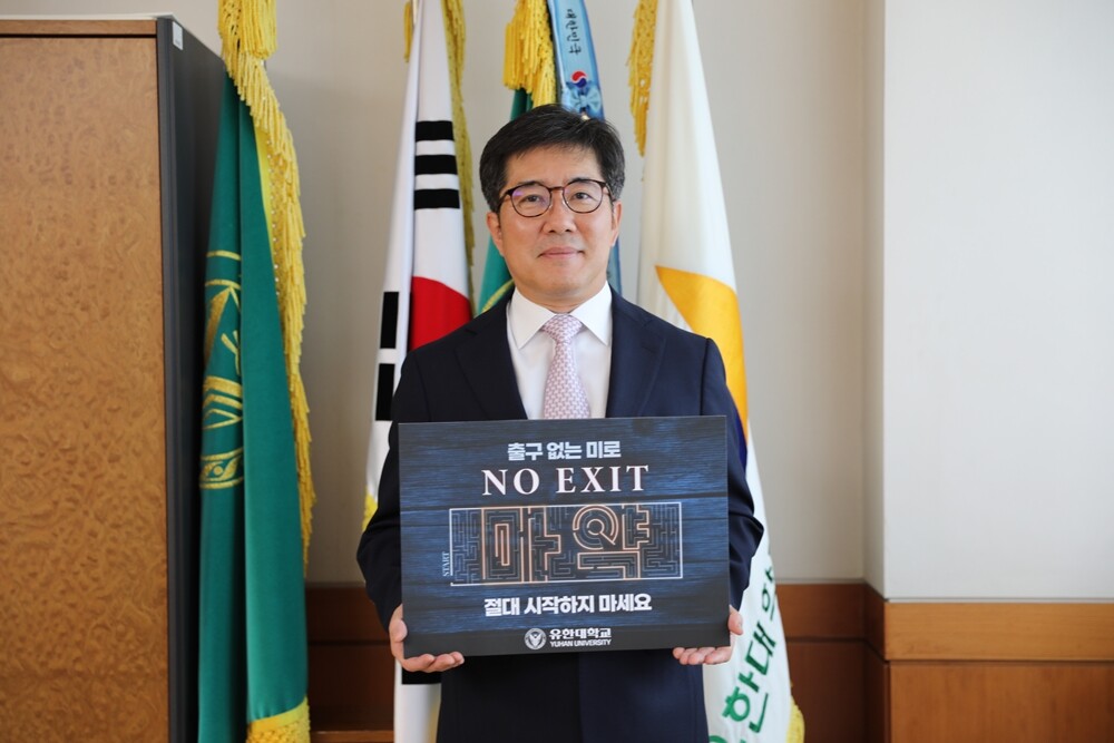 [대학저널 온종림 기자] 유한대학교 김현중 총장이 지난 6월 30일 마약 중독 방지 및 심각성을 알리기 위해 경찰청과 식품의약품안전처, 한국마약퇴치운동본부가 공동으로 시행하는 마약예방 'NO EXIT' 캠페인에 동참했다.