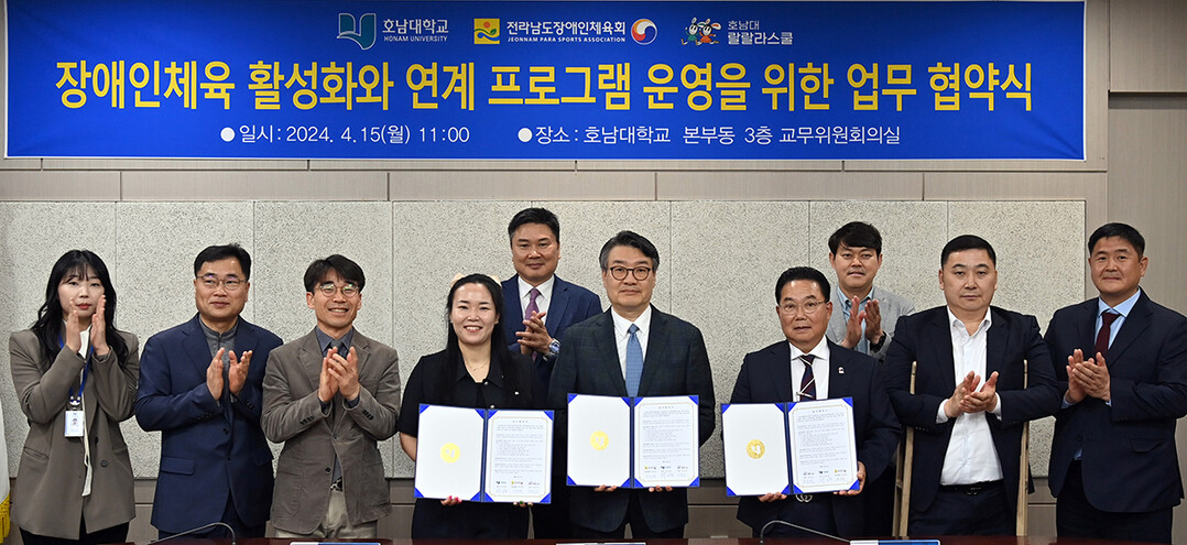 [대학저널 이선용 기자] 호남대학교가 4월 15일 본부동 3층 교무위원회의실에서 전라남도장애인체육회, 호남대랄랄라스쿨과 업무협약을 체결했다.