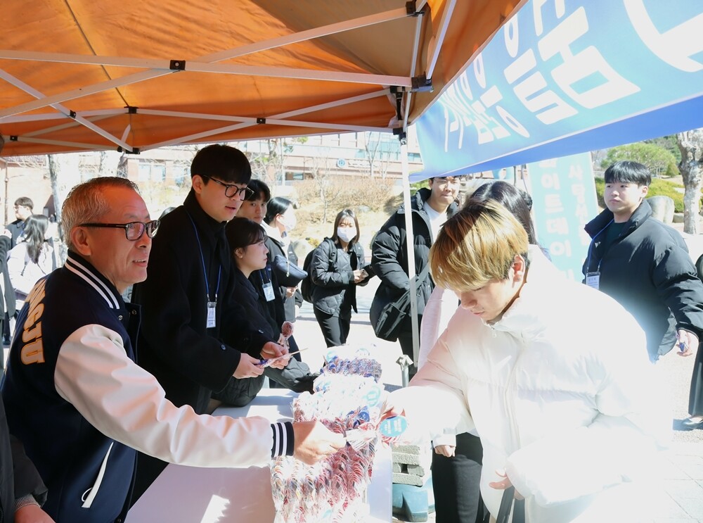 [대학저널 온종림 기자] 청주대학교는 13일 화이트데이를 하루 앞두고 대학 중문 일대에서 학생들에게 간식을 나눠주며 학생을 격려하고 소통하는 행사를 했다.