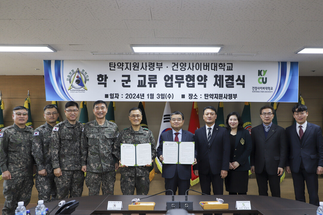 [대학저널 이선용 기자] 건양사이버대학교와 육군탄약지원사령부가 ‘상호발전을 위한 협력 및 교류 활성화’를 위해 3일 대전 대덕구 장동에 위치한 육군탄약지원사령부에서 업무협약을 체결했다.