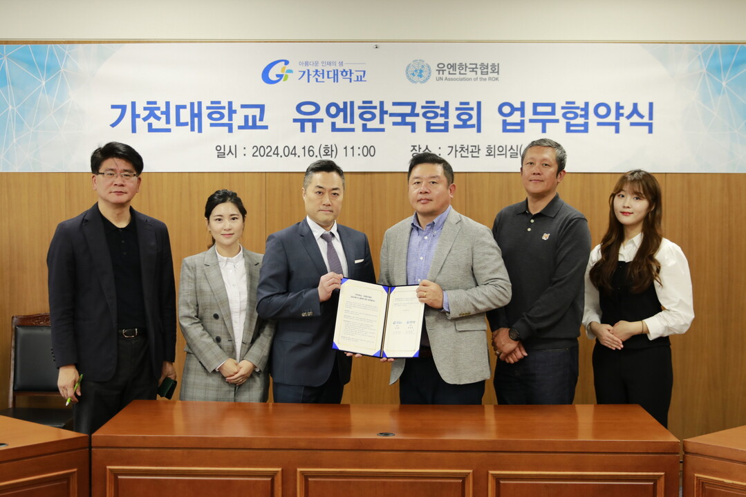 가천대와 한국유엔협회 관계자들이 MOU를 체결하고 기념촬영을 하고 있다. 사진=가천대 제공 |