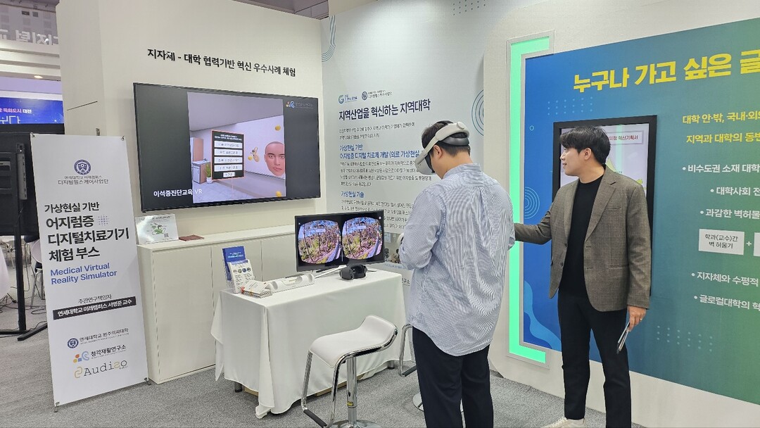이날 디지털헬스케어사업단은 R&D 우수사례로 연세대 미래캠퍼스 서영준 교수 연구실(청각재활연구소)에서 개발한 ‘의료 가상현실 시뮬레이터’ VR 체험 및 전시관을 운영하며 디지털치료제에 대해 홍보했다.