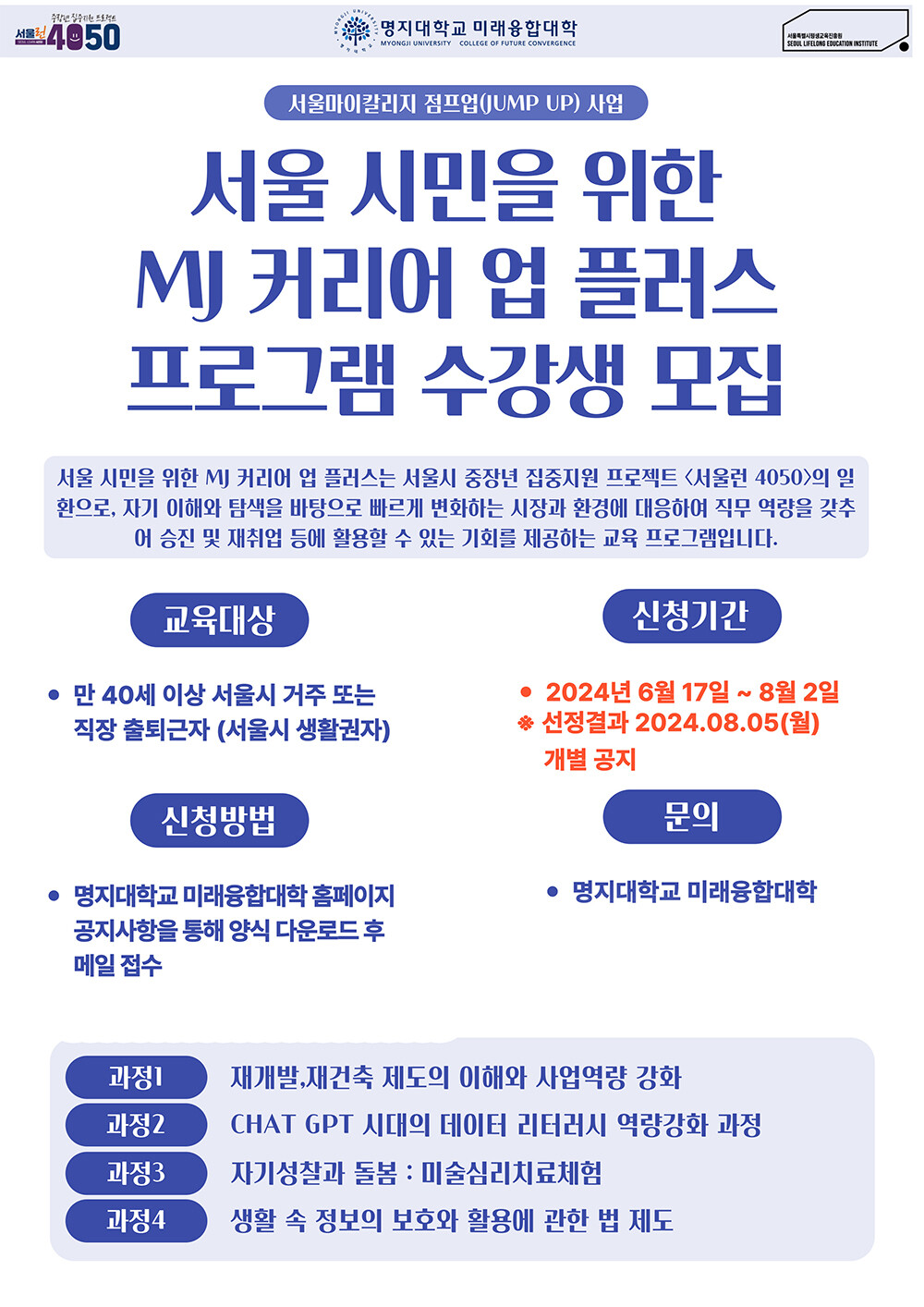 명지대 미래융합대학의 “서울 시민을 위한 MJ 커리어 업 플러스” 프로그램은 서울시평생교육진흥원 <2024년 서울마이칼리지 중장년 점프업(Jump Up)> 사업으로 선정되었으며, 서울시의 중장년 집중지원 프로젝트 ‘서울런4050’의 일환으로 진행된다.