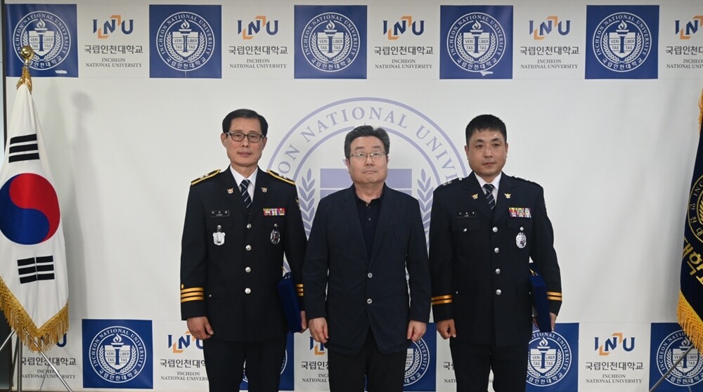 왼쪽부터 박희철 송도국제도시2지구대장, 유우식 인천대 교학부총장, 이헌주 연수경찰서 생활안전계 경감. 사진=인천대 제공 |