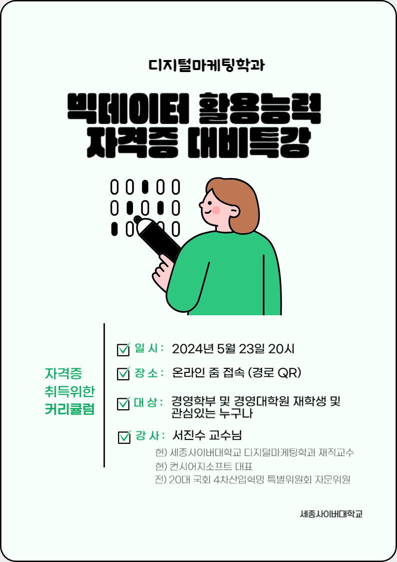 이날 자격증 특강은 학교에서 ‘마케터를 위한 인공지능’ 수업을 담당하는 서진수 교수가 지도했다. 특히 재학생을 중심으로 보편화되고 있는 빅데이터 활용 능력에 대한 지속적 관심을 반영하고 자격증 취득을 목표로 하는 재학생들이 언제든지 자격증 취득 콘텐츠에 접근할 수 있도록 학과 유튜브 채널에도 동시 게재됐다.