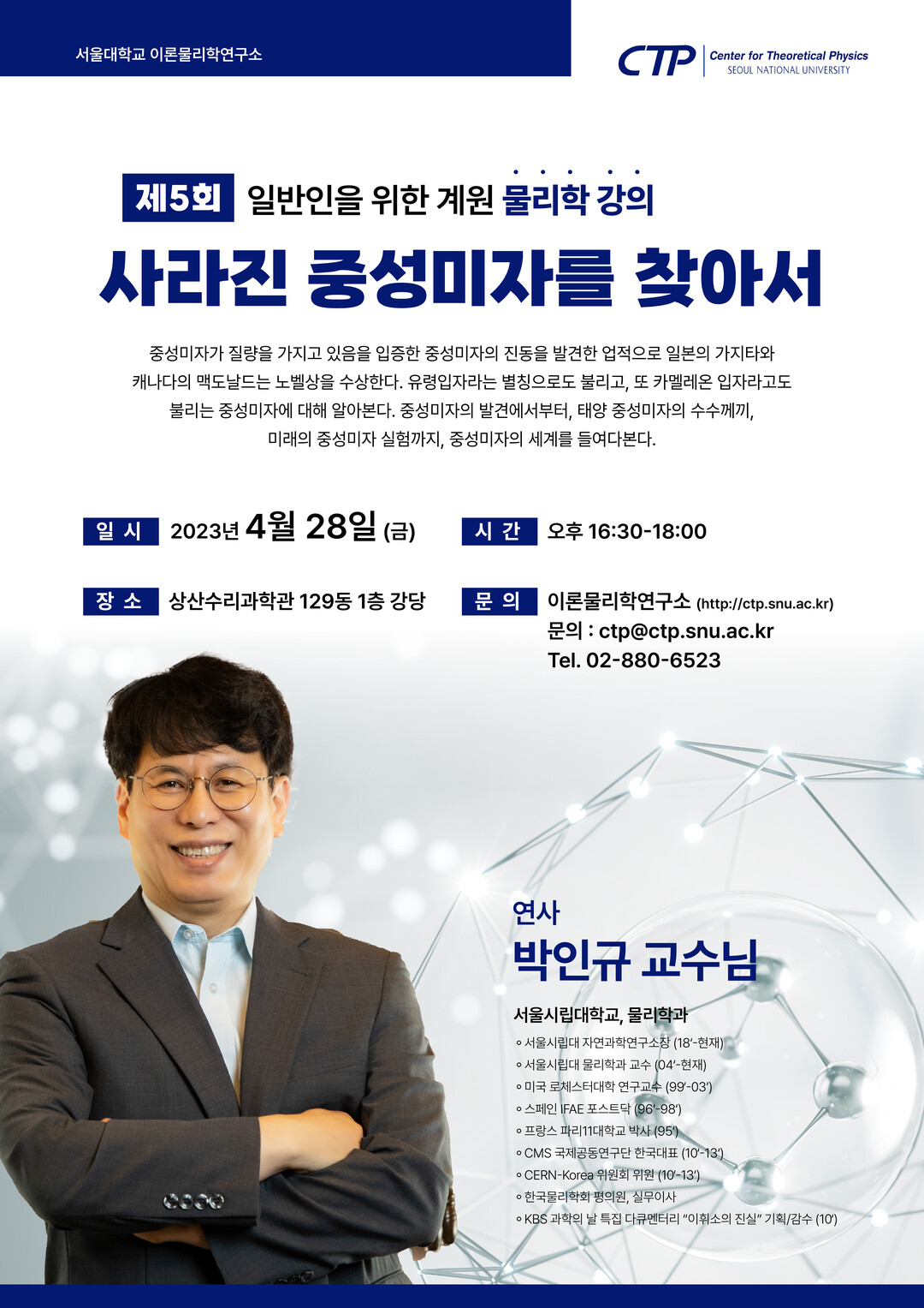박 교수는 강의에서 ‘있어도 없는 듯한’ 중성미자의 발견 과정과, 태양 중성미자의 수수께끼, 미래의 중성미자 실험까지, 중성미자의 세계를 들여다 보는 강의를 할 예정이다.