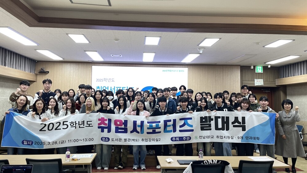 전남대 학생처 취업지원실은 28일 도서관별관 지하 취업강의실2에서 ‘2025학년도 취업서포터즈 발대식’을 개최하고, 각 단과대학에서 선발된 취업서포터즈 67명에게 임명장을 수여했다.