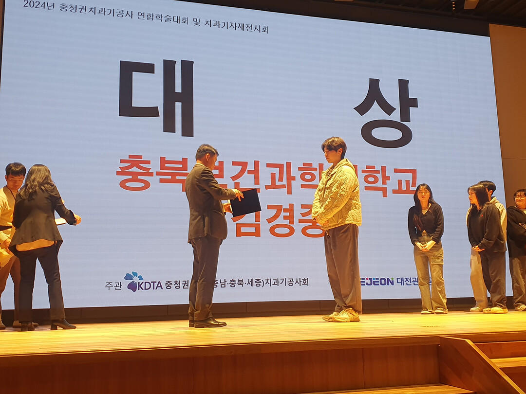 2024년 충청권 치과기공사 연합 학술대회 및 치과 기자재 전시회에서 김경중 학생이 대상을 수상하고 있다. 사진=충북보건과학대 제공 |