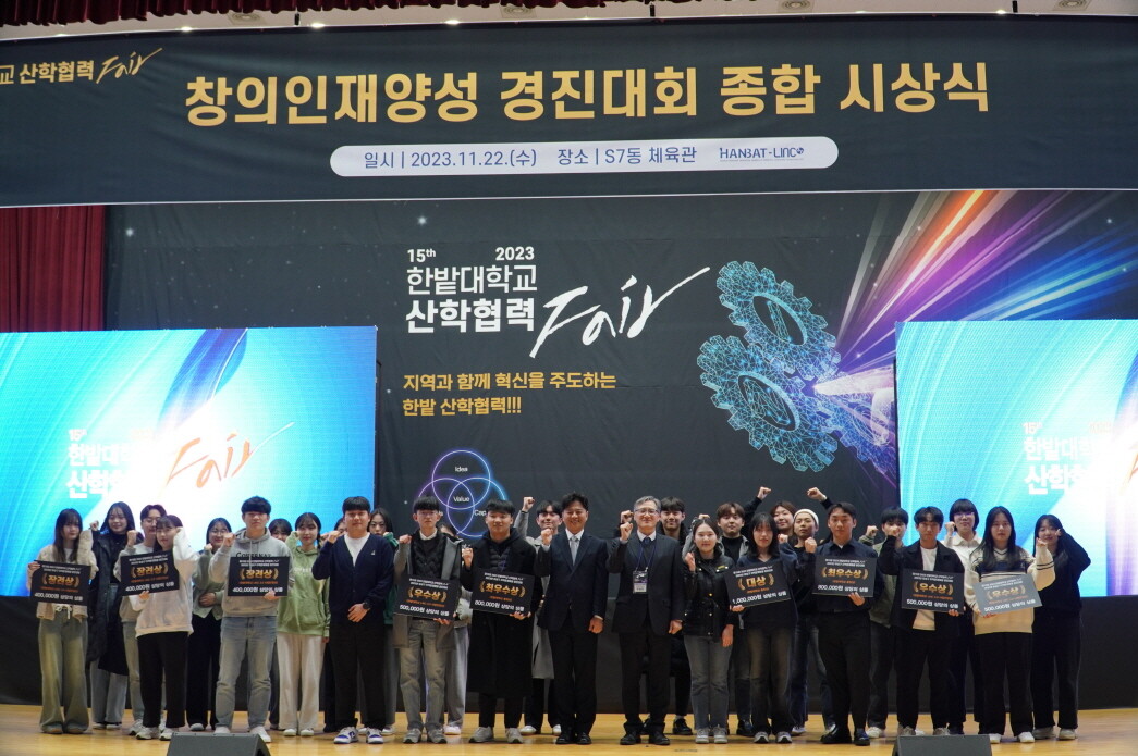 한밭대가 지난 22일 개최한 ‘2023년 유성구 지역문제해결형 경진대회’에서 입상한 학생들이 기념촬영을 하고 있다. 사진=한밭대 제공 |