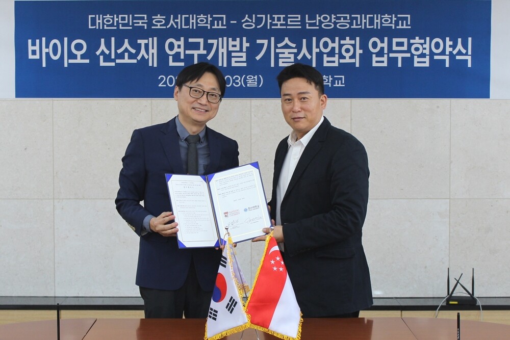 호서대와 싱가포르 난양공과대학이 3일 ‘바이오 신소재 연구개발 및 기술사업화’를 위한 업무협약을 체결했다. 사진=호서대 제공 |