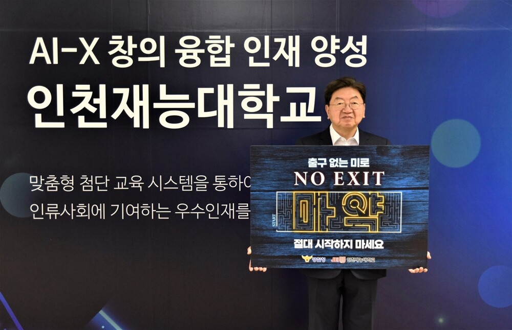 [대학저널 온종림 기자] 이남식 인천재능대학교 총장이 19일 마약중독과 범죄의 위험성을 알리는 ‘NO EXIT(출구없음)’ 캠페인에 동참했다.