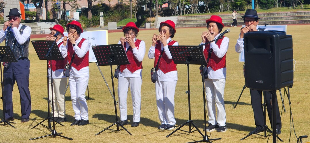 '더불어樂노인 복지관 선배시민 공연봉사단' 단원들이 지난 12일 광주여대 학생들과 함께 진행한 ‘노인 인식 개선 캠페인’에서 하모니카를 불면서 청년세대와 소통하고 있다. 사진=광주여대 제공 |