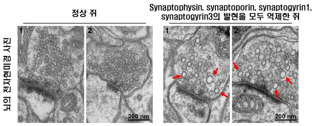 정상 쥐(왼쪽)와 시냅토파이신을 비롯한 시냅스 소낭 연관 단백질(synaptoporin, synaptogyrin1, synaptogyrin3)을 모두 녹아웃(knock-out)한 쥐의 실제 뇌 속 신경세포 시냅스 모습으로, 4가지 단백질이 모두 제거됐을 때, 정상 쥐에 비해 매우 큰 사이즈의 시냅스 소낭(빨간색 화살표)이 만들어지는 것을 볼 수 있다. |