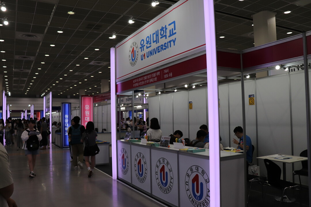 [대학저널 조영훈 기자] 한국대학교육협의회가 주최하는 '2024학년도 수시 입학정보박람회'가 20일 서울 삼성동 코엑스에서 개막됐다. 오는 22일까지 열리는 수시박람회에는 전국 146개 대학이 참가하고 있다. 현재 수험생들이 대학부스에서 입시 상담을 진행하고 있다. 사진은 유원대학교 상담부스 모습.