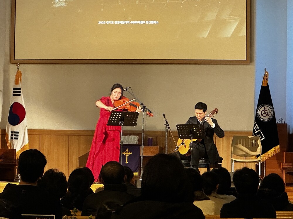 [대학저널 온종림 기자] 한신대학교가 지난 2일 샬롬채플 대예배실에서 비올리스트 김남중의 음악회를 개최했다. 이번 음악회는 경기도에서 주최하고 한신대에서 주관하는 ‘2023년 경기도 평생배움대학 GCC 4060 새롭G 한신대 캠퍼스’ 사업의 일환으로 UN국제평화기여 예술가상을 수상한 김남중 비올리스트를 비롯 정욱 클래식 기타리스트, 황지희 피아니스트가 3시간 동안 ‘음악으로 전하는 소통의 기술’이라는 주제를 가지고 다양한 곡들을 선보였다. 또한 미스코리아 경기인천 선 최예나 한국무용수의 특별 무대도 마련됐다.