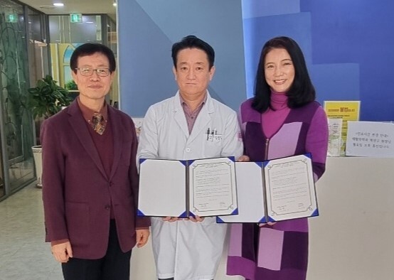 왼쪽부터 양재수 안양대 산학부총장, 이젠의료재단 박열수 원장, 김선명 교수. |