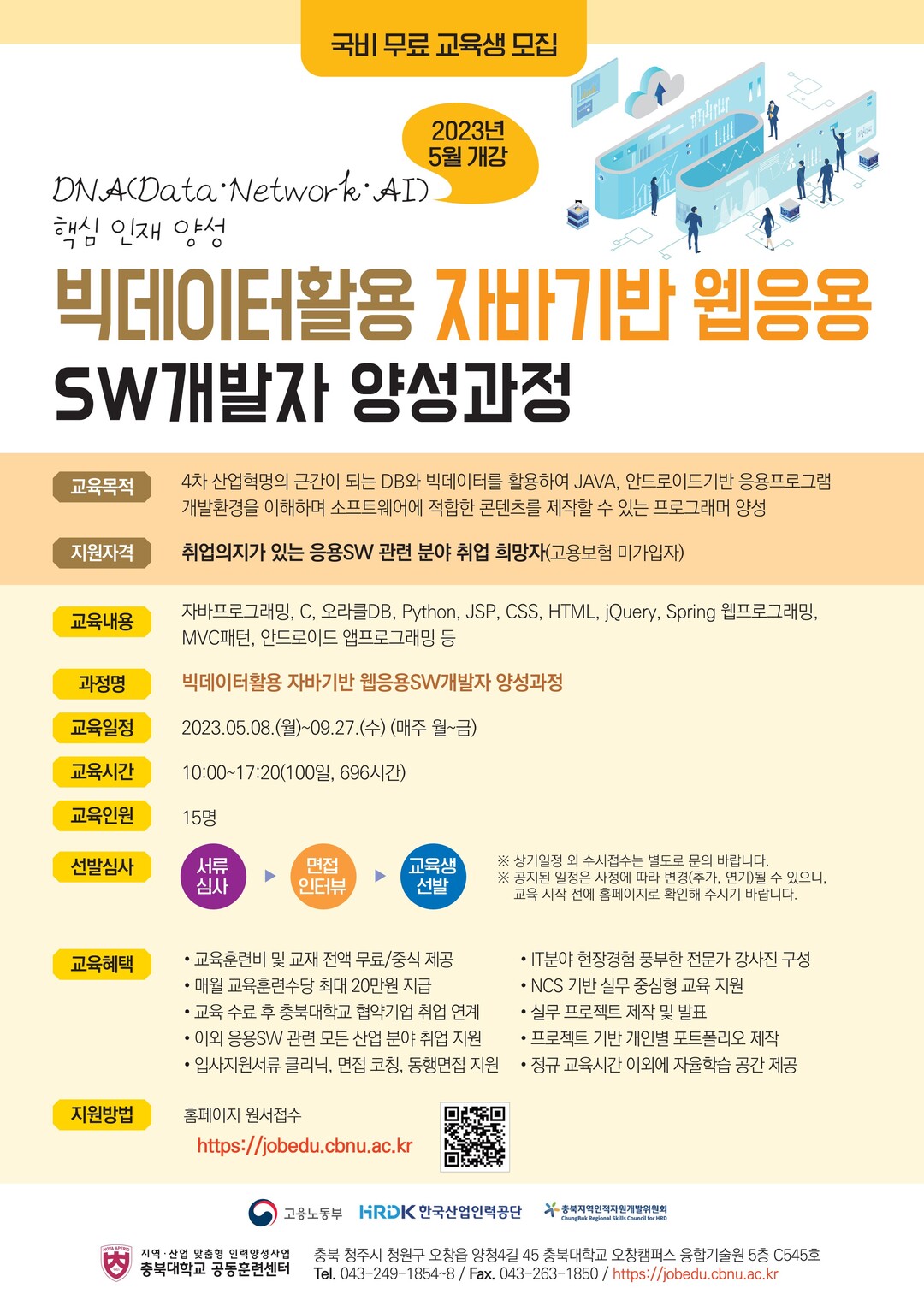 이 과정은 5월 8일부터 9월 27일까지 운영하며, 4차 산업혁명의 근간이 되는 DB와 빅데이터를 활용해 JAVA 기반 웹응용 소프트웨어 프로그래머 양성을 목적으로 개설된다.