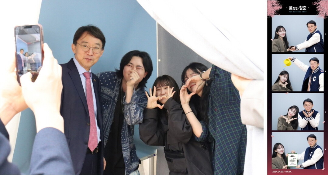 총장네컷 부스에서 학생들과 사진 촬영을 하는 박상규 총장(왼쪽)과 실제 총장네컷 사진(오른쪽). 사진=중앙대 제공 |