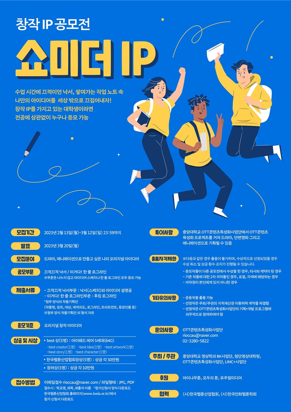 중앙대는 첨단영상대학원이 오는 3월 12일까지 창작 IP(지식재산) 공모전 쇼미더IP를 진행한다고 20일 밝혔다.
