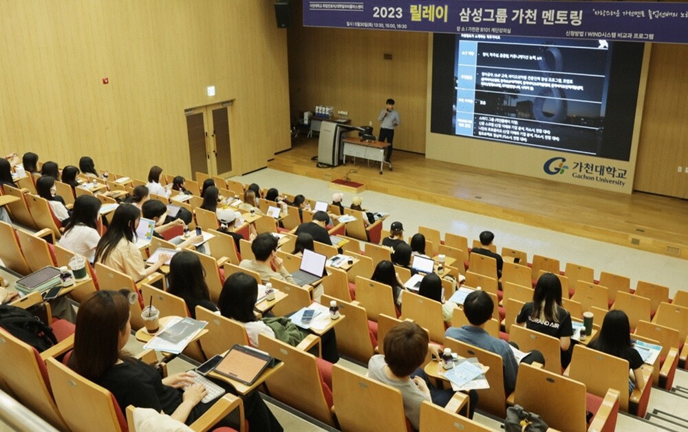 가천대 대학일자리플러스센터가 30일 대학 가천관 계단강의실에서 개최한 ‘릴레이 가천 멘토링’에서 가천대 졸업생 멘토가 삼성그룹 직무, 취업준비방법에 대해 설명하고 있다. 사진=가천대 제공 |